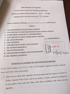 Gen. Kayihura is in particular outraged by Red Pepper publication of 18th April 2017, where a missive report about the murder investigation is reported with a promise of published more details in subsequent publications.