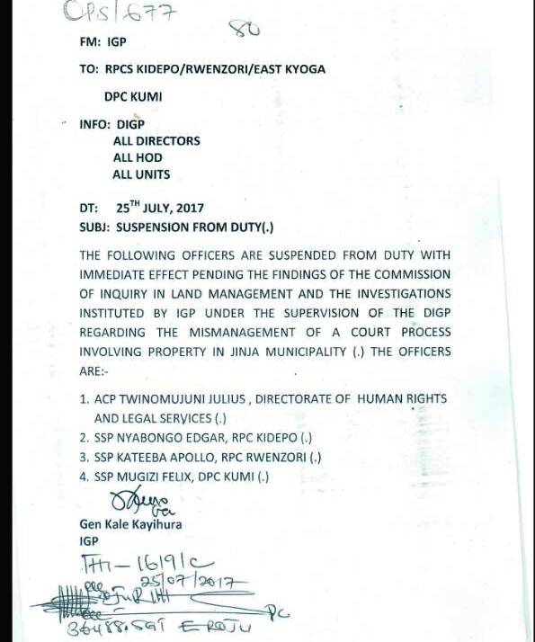 “The following officers are suspended from duty with immediate effect pending findings of the commission of inquiry in land management and the investigation instituted by IGP under the supervision of DIGP regarding the mismanagement of court process involving court process in Jinja,” reads Kayihura’s directive.