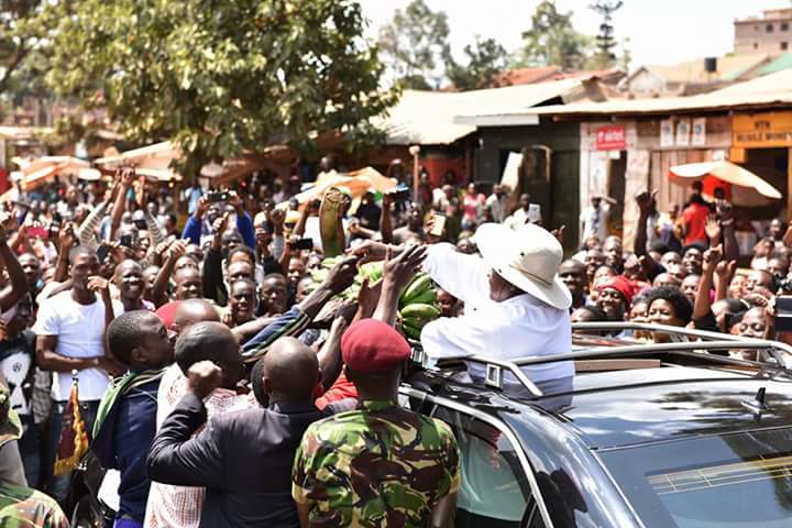 Traders of Munkere Market on Kireka-Banda stretch gifted President Yoweri Kaguta Museveni with a bunch of bananas (matooke) earlier today Thursday