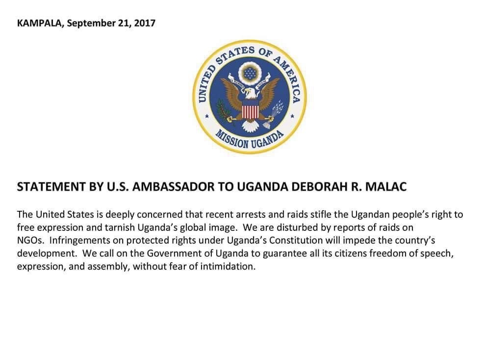 According to a statement issued by the US ambassador Deborah Malac, her government is deeply concerned by the arrests and raids that stifle the people’s rights and tarnishes Uganda’s image globally.