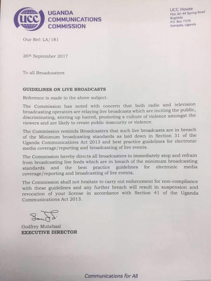 UCC head Eng Godfrey Mutabazi has since written to all radios and TVs saying they must comply with the order or risk being closed.