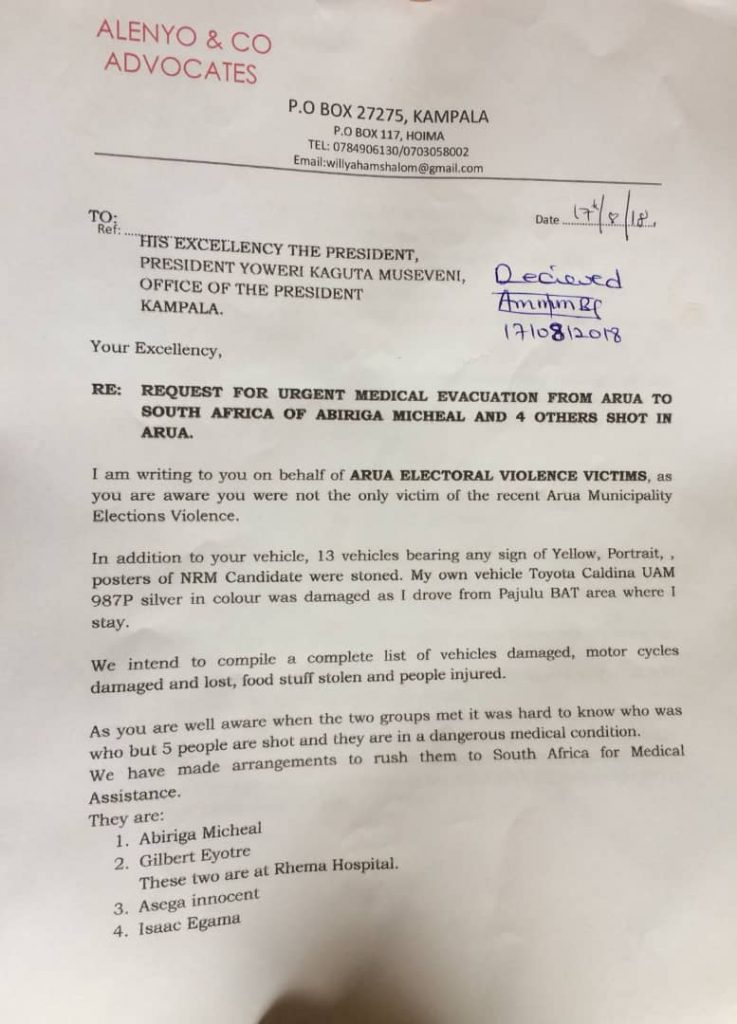 The letter was received by State House on August 17, 2018. Mr Alenyo further told the President that the group wasn’t part of the violence orchestrated by the Red Army.