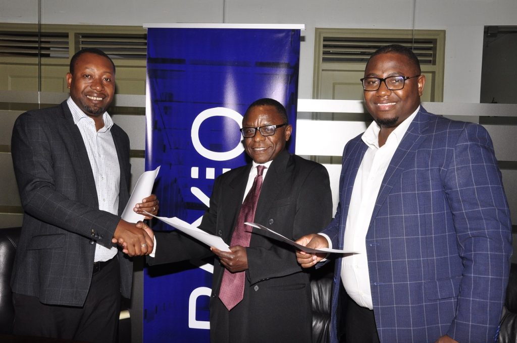Raxio’s General Manager James Byaruhanga and Paul Nalikka, Director, Hamilton Telecom, flanked by Ahura Vianne Allan the CFO, signed for their respective organisations, at Raxio’s offices at Rwenzori Towers, Nakasero, Kampala.
