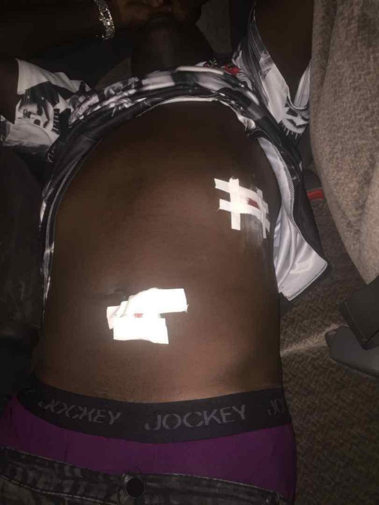 Pictures of the singer lying in a car seemingly whimpering in pain with two wounds on his stomach are circulating on social media platforms.