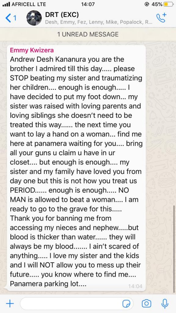 Desh Kananura you are the brother I admired till this day please STOP beating my sister and traumatizing her children…. enough is enough I have decided to put my foot down my sister was raised with loving parents and loving siblings she doesn’t need to be treated this way the next time you want to lay a hand on a woman… find me here at panamera waiting for you…. bring all your guns u claim u have in ur closet…. but enough is enough…. my sister and my family have loved you from day one but this is not how you treat us PERIOD enough is enough NO MAN is allowed to beat a woman…. I am ready to go to the grave for this Thank you for banning me from accessing my nieces and nephew but blood is thicker than water they will always be my blood I ain’t scared of anything I love my sister and the kids and I will NOT allow you to mess up their future you know where to find me…. Panamera parking lot….