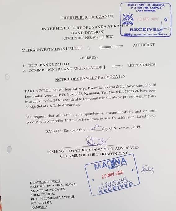 “We have been instructed by DFCU to represent it in the above proceedings in place of Sebalu and Lule advocates. We request that all further correspondences and or court process in connection thereto be forwarded to us,” a notice filed by Kalenge, Bwanika, Sawa and Co. Advocates and received by court on November 20 reads.