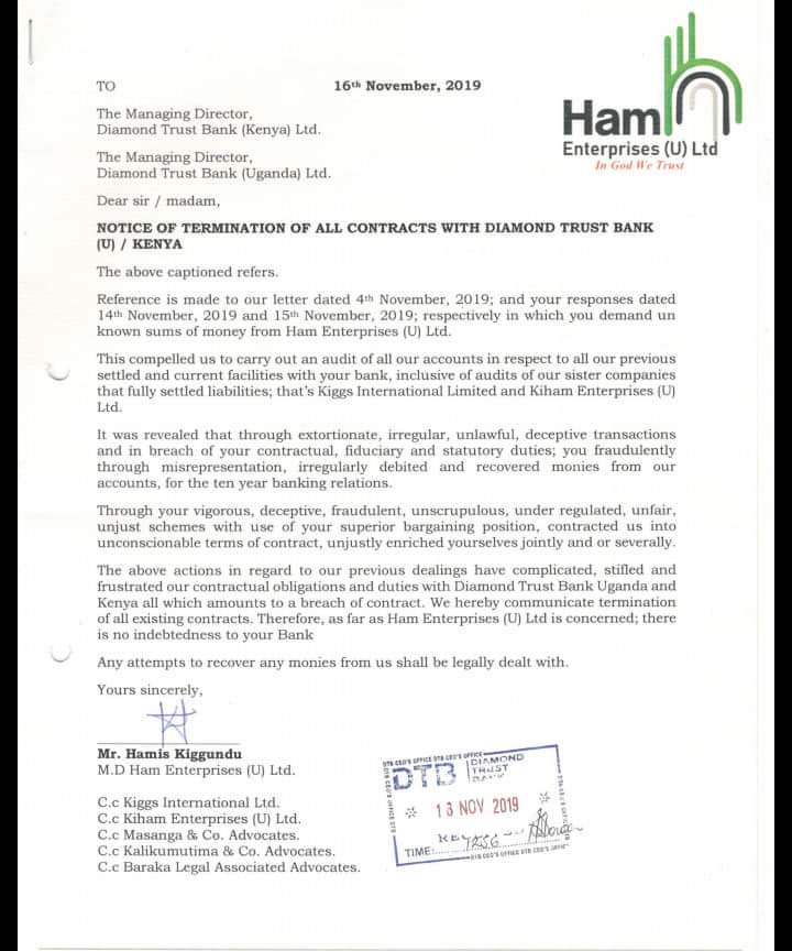 “That the actions of the bank in regard to their previous dealings had complicated, stifled and frustrated their contractual obligations and duties with Diamond Trust Uganda and Kenya all which amounted to breach of contract. The company thereby communicated termination of all existing contracts. Clearly stating that, as far as Ham Enterprises (U) Ltd is concerned; there was no indebtedness to the bank.”
