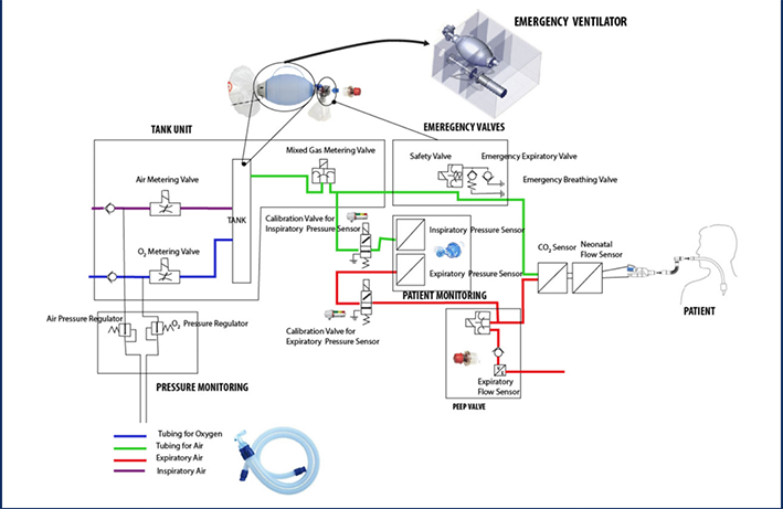 The proposed Ventilator is based on an electromechanical Architecture utilizing Motors, Potentiometers, Air Pressure Transducers, Air Flow Transducers, a Valve Mask Compression Unit, Inhalation & Exhalation Control Valves, and a Monitoring System. These assist in inhalation and exhalation by increasing and decreasing the patient’s airway pressure or tidal volume through controlled inhalation and exhalation.