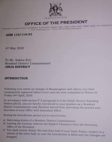 Jinja Resident District Commissioner (RDC) Eric Sakwa has on Friday May 9 been interdicted and asked to hand over office with immediate effect.