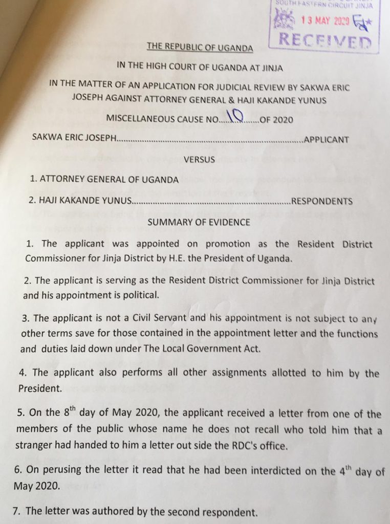 “The applicant is serving as the Resident District Commissioner for Jinja District and his appointment is political. The applicant is not a Civil Servant and his appointment is not subject to any other terms save for those contained in the appointment letter and the functions and duties laid down under The Local Government Act. The applicant also performs all other assignments allotted to him by the President,” reads part of Sakwa’s application.