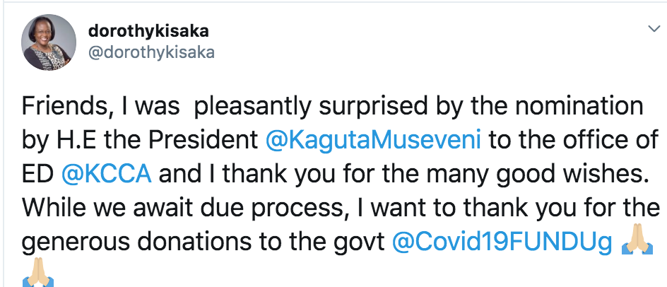 “Friends, I was pleasantly surprised by the nomination by President Kaguta Museveni to the office of ED of KCCA and I thank you for the many good wishes. While we await due process, I want to thank you for the generous donations to the government for COVID-19 Fund,” she said on Tuesday.