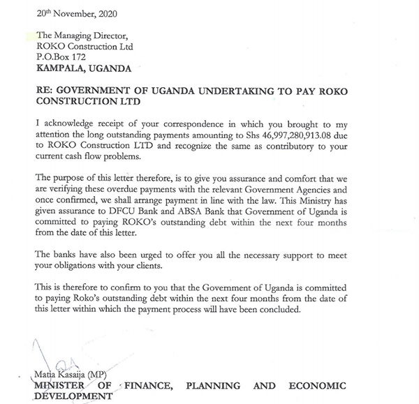 This is acknowledged by the minister of finance, planning and economic development, Matia Kasaija in a comfort letter dated November 22, 2020 to the Roko Managing Director.