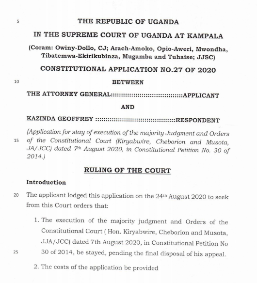 “In the result, we accordingly grant the application as prayed and order that: (a) The execution of the majority judgment and orders of the Constitutional Court (Kiryabwire , Cheborion and Musota, JJA/JCC) dated 7th August 2020 in Constitutional Petition No. 30 of 2014 be and is hereby stayed pending the hearing and determination of the intended appeal by the applicant,” Supreme Court ruled on February 12.
