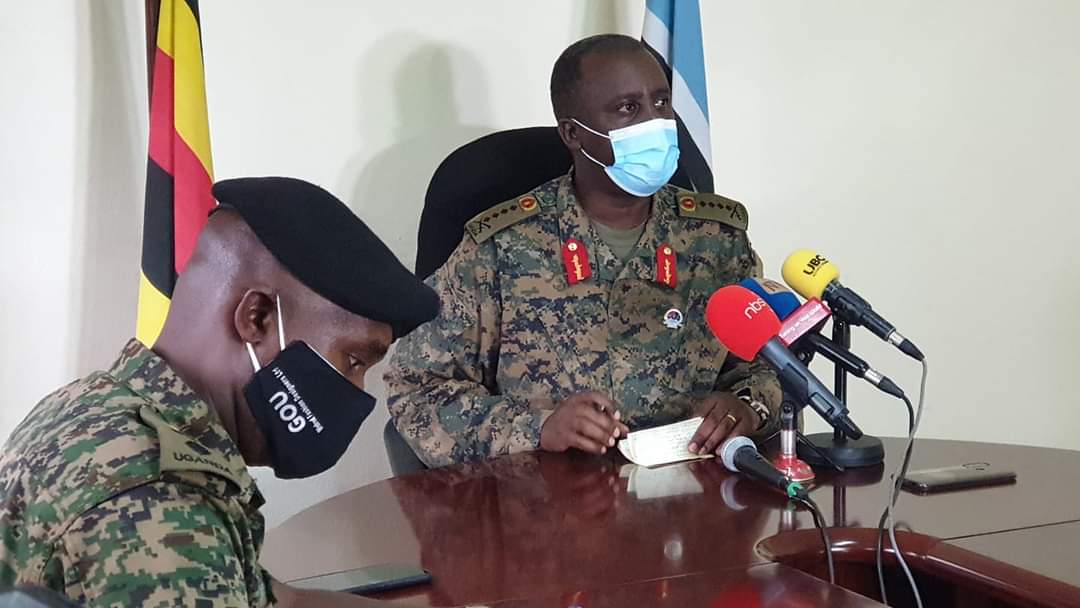 The CDF was flanked by the Defence Spokesperson, Brig Gen Flavia Byekwaso and her Deputy Lt Col Deo Akiiki.