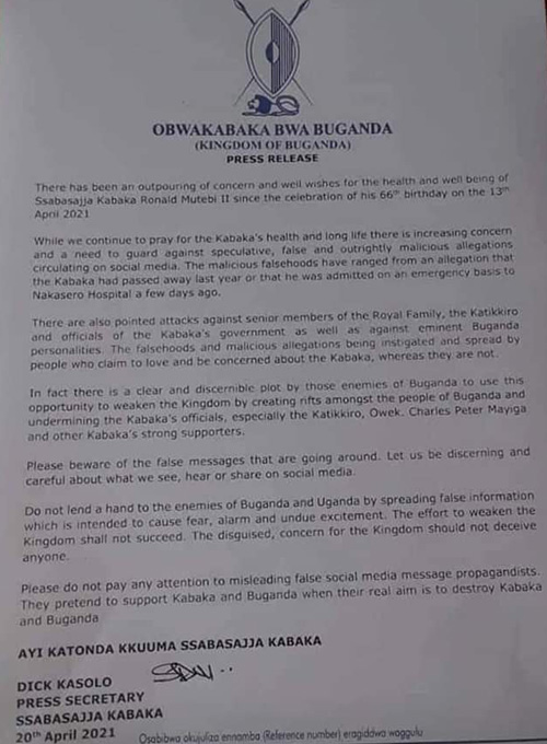 “While we continue to pray for Kabaka and his long life, there is increasing concern and a need to guard against speculative, false and outrightly malicious allegations circulating on social media,” he added.