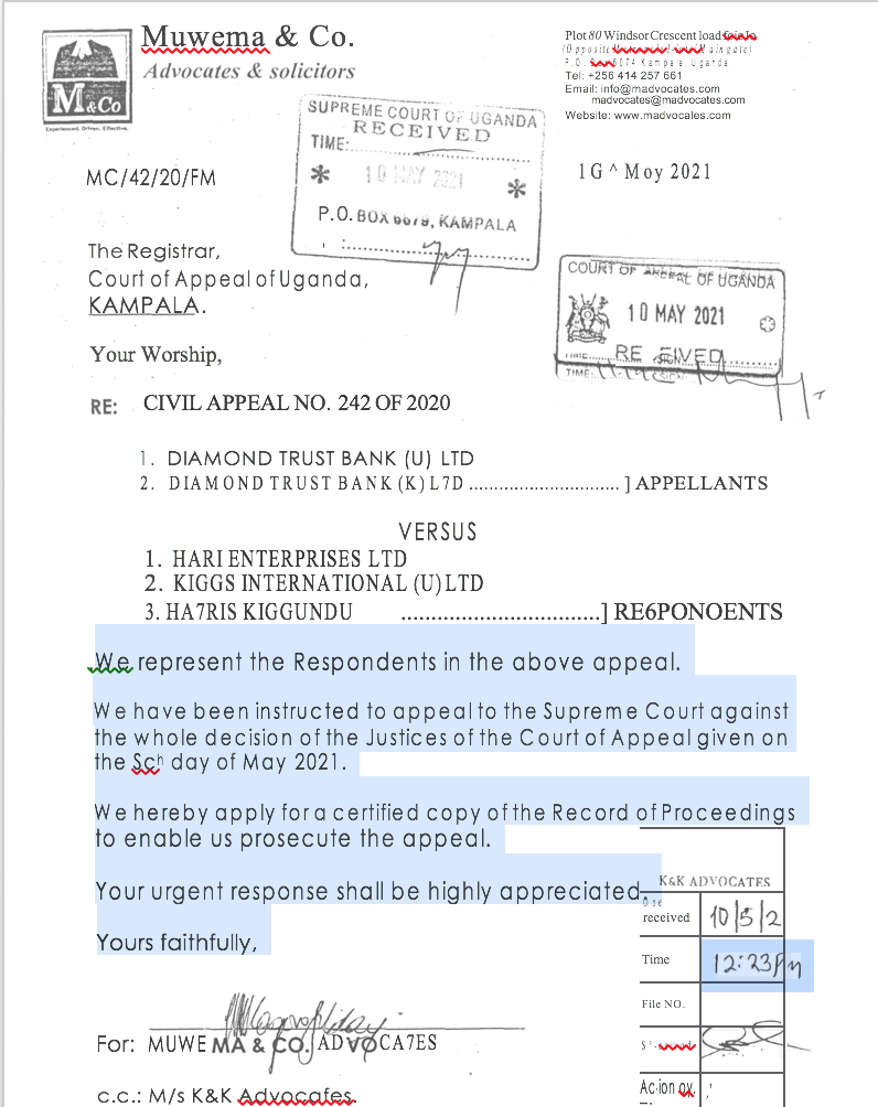 “We represent the Respondents in the above appeal. We have been instructed to appeal to the Supreme Court against the whole decision of the Justices of the Court of Appeal given on the 5th day of May 2021. We hereby apply for a certified copy of the Record of Proceedings to enable us prosecute the appeal. Your urgent response shall be highly appreciated. Yours faithfully, Muwema and Co. Advocates,” the application filed in the Supreme Court reads.