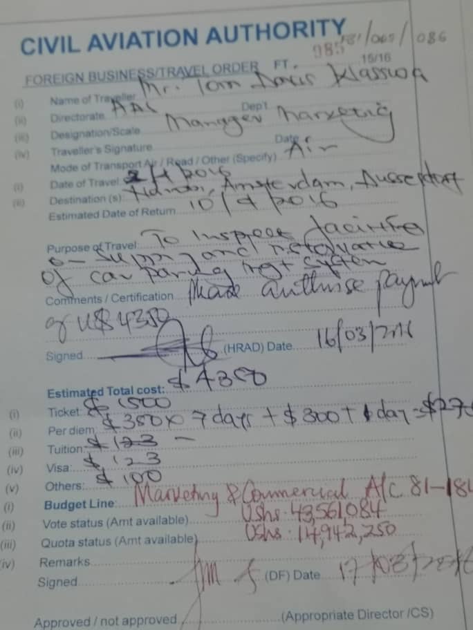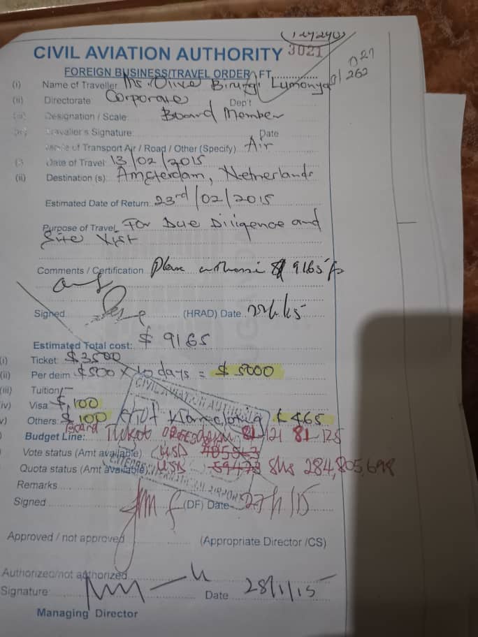 “Notable among them are Ms. Olive Birungi Lumonya and Mr. Tom Davis Waswa. For starters, Ms Lumonya was for two terms, a CAA Board Member and while as a Board member she undermined corporate governance principles. She is reported by her former colleagues to have forced her way to do management work on many occasion for selfish motives and personal gains. Sir, there is a scenario in which she is well known and it involves the USD $4,800,000 Supply and Installation of Baggage Handling System (BHS) project at Entebbe International Airport. We have it on record how Lumonya insisted to travel to Netherlands to the Headquarters of VANDERLANDE disguised as carrying out a due diligence, although the actual reason was to discuss a commission (bribe).” the concerned employees wrote.