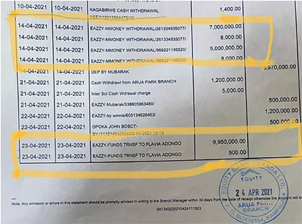 At the head offices, after checking the system, management told me that I transferred shs 9.5m through eazzy funds transfer to someone called Flavia Adongo using a phone application.