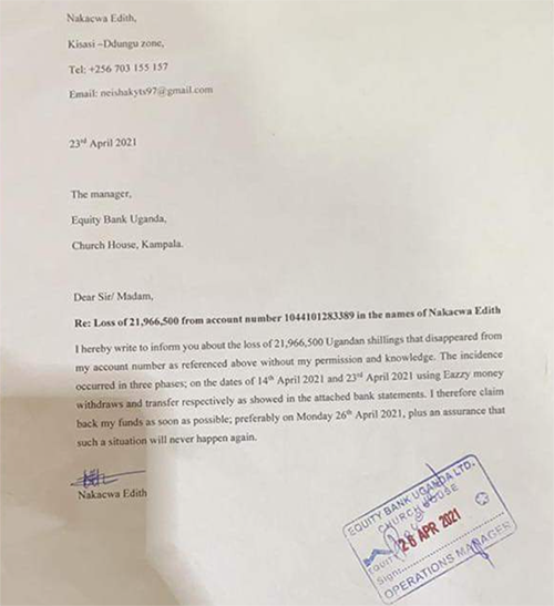 Equity Bank has come under fire to explain how a customer, Edith Nakacwa’s deposit(s) amounting to shs 21 million was withdrawn from her account through e-banking (eazzy funds transfer) without her knowledge.