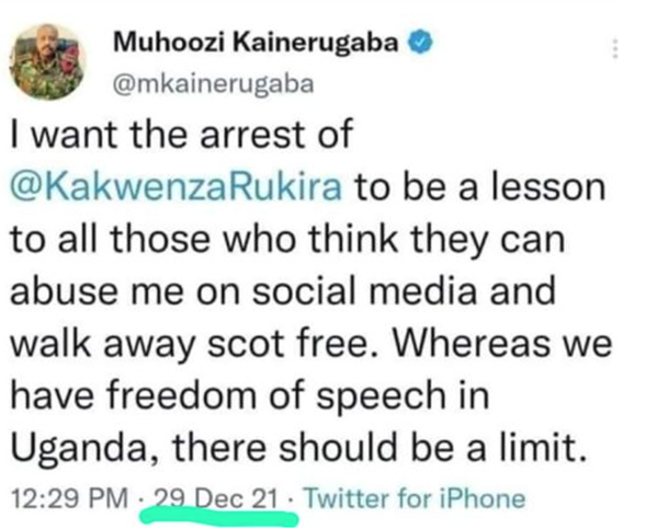 According to the ‘screenshot’ of the alleged Tweet, Muhoozi reportedly said he wanted Kakwenza’s arrest to be a “lesson to those who abuse me on social media and think they walk away scot free. Whereas we have freedom of speech in Uganda, there should be a limit.”
