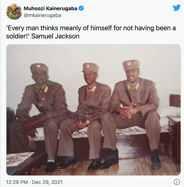 Additionally, at the same time (12:29PM), Muhoozi Tweeted on his official account: “‘Every man thinks meanly of himself for not having been a soldier!’ Samuel Jackson.” This Tweet’s timestamp (as showed below) is indicated as 12:29 PM Dec 29, 2021.