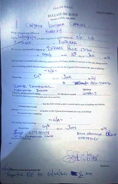 According to documents obtained by this website, Isingoma barely spent a night in the cells he was released on police bond with instructions to reappear for questioning after week.