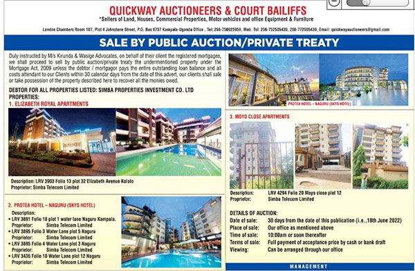 The Quickway Auctioneers and Court Bailiffs gave Bitature’s Simba Properties Investment Company Limited, under which the three properties are owned, 30 calendar days within which to clear the loans or watch the properties auctioned or sold by private treaty.