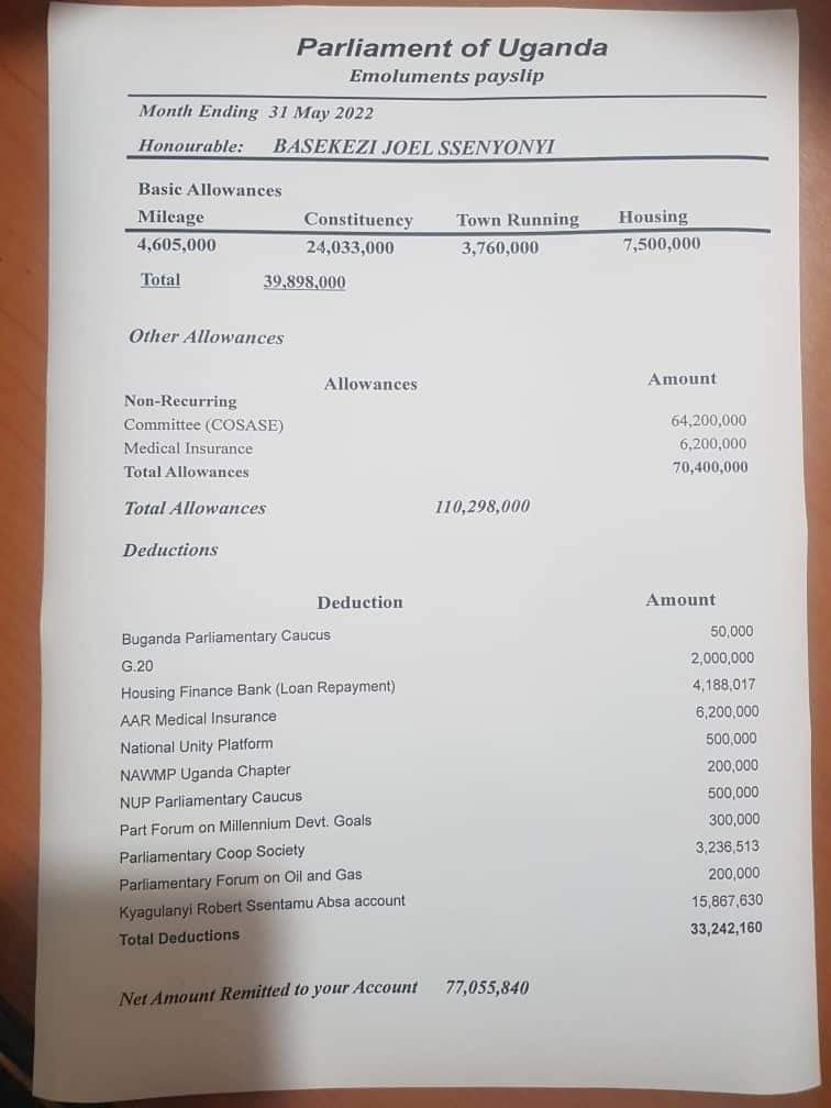 In relation to the above development, an emolument pay slip from Parliament belonging to COSASE chairman also a NUP MP and spokesersonJoel Ssenyonyi has been doing rounds on social media.