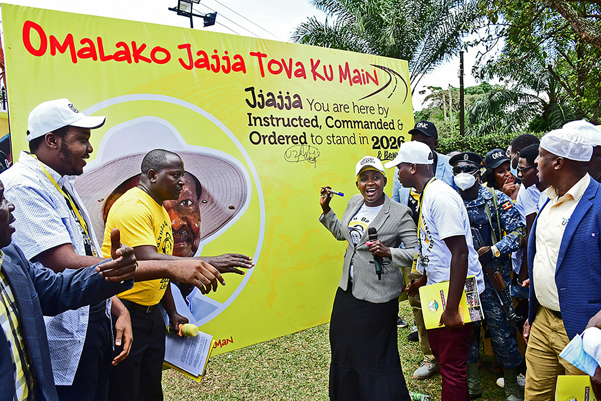 The slogan was launched in October last year by the group of Bazzukulu led by Hajati Namyalo at the Kyambogo office. Namayalo and his cohort moved around the country seeking endorsement for the President to run in 2026.