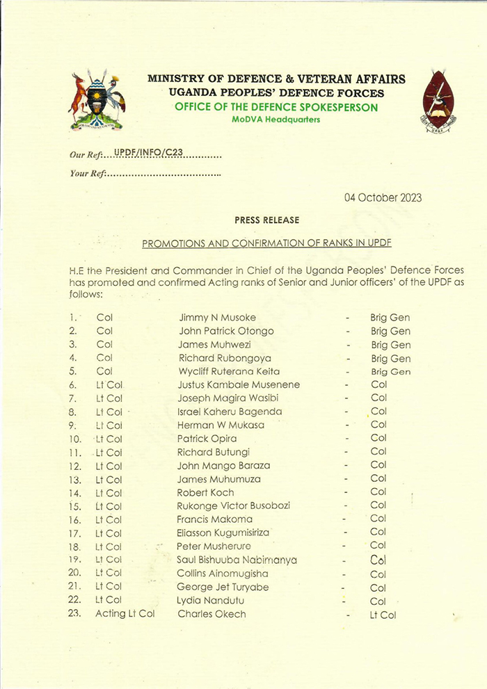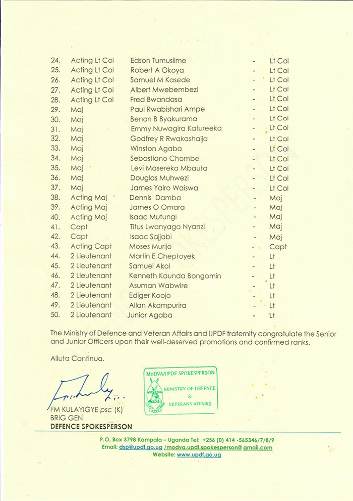 President Yoweri Kaguta Museveni who is the Commander in Chief (CiC) has promoted a total number of 50 UPDF officers, 5 among whom have been Colonels elevated to Brigadier Generals including, confirming those who have been in acting capacity to now full ranks.