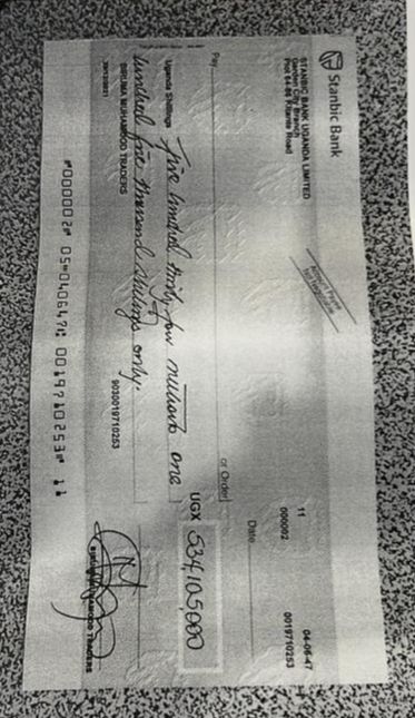 Mohamood issued her a check, numbered 0019710253, for UGX 534,105,000 (approximately USD 143,000) as a refund.