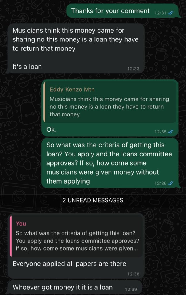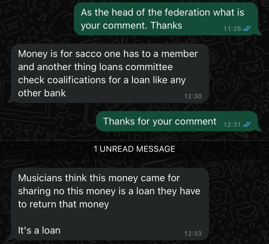 The unrest continued as reports emerged that another top musician received only 15 million delivered by Baliruno at 4 am at Mezo Noir Bar in Kololo, only to reject the sum and he was subsequently be offered 38 million.