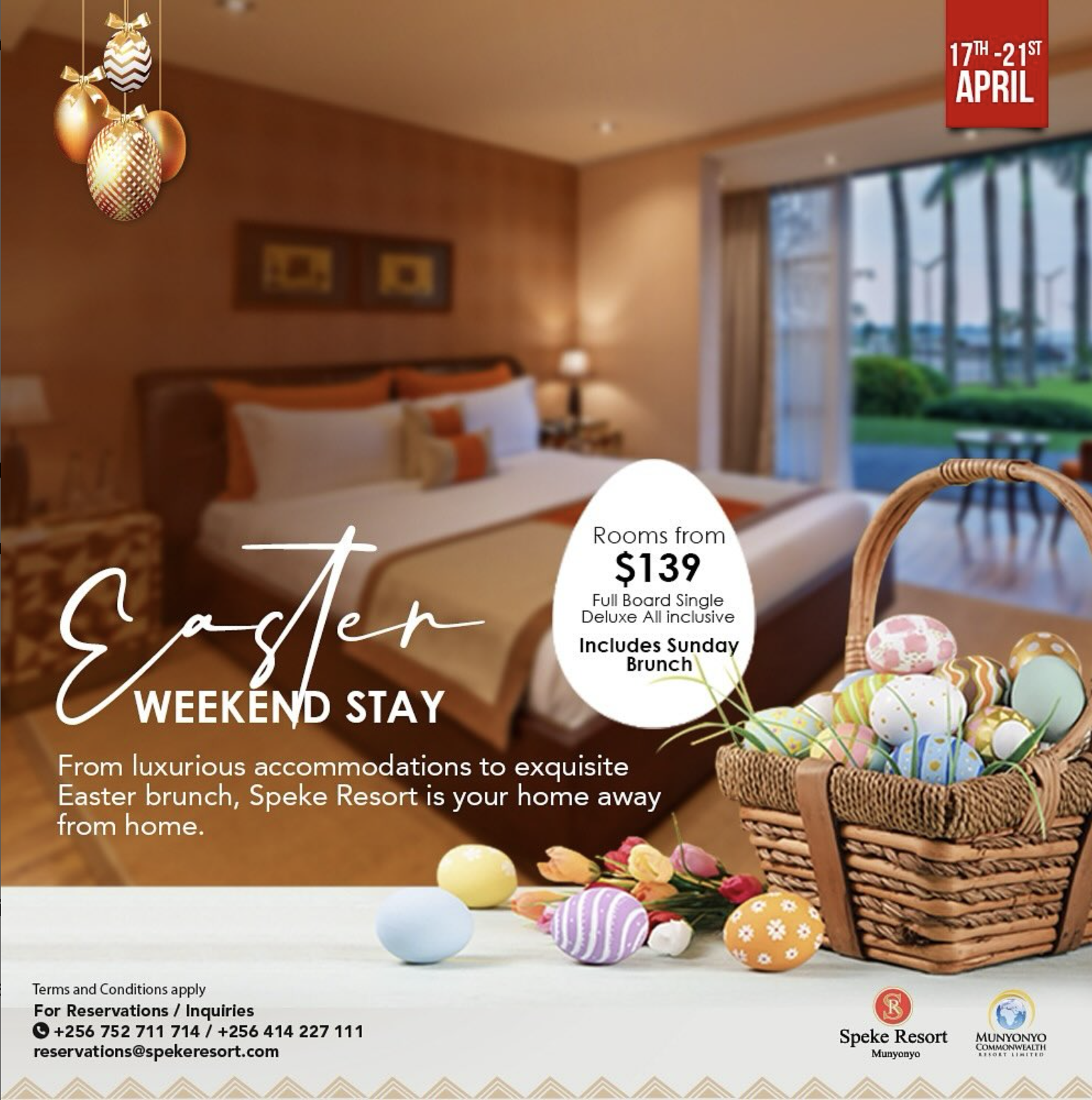 For those who wish to extend their holiday, Speke Resort Munyonyo offers a Full Board Single Deluxe package at $139 per night. This package includes accommodation and access to the Easter Sunday Brunch.