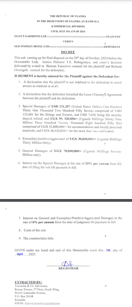 The High Court Commercial Division has issued a decree in relation to the last year ruling in whch Select Garment boss , Billy Ahimbisibwe defeated Forest Mall/ Old Stanley Hotel owner Stanslas Isiagi.