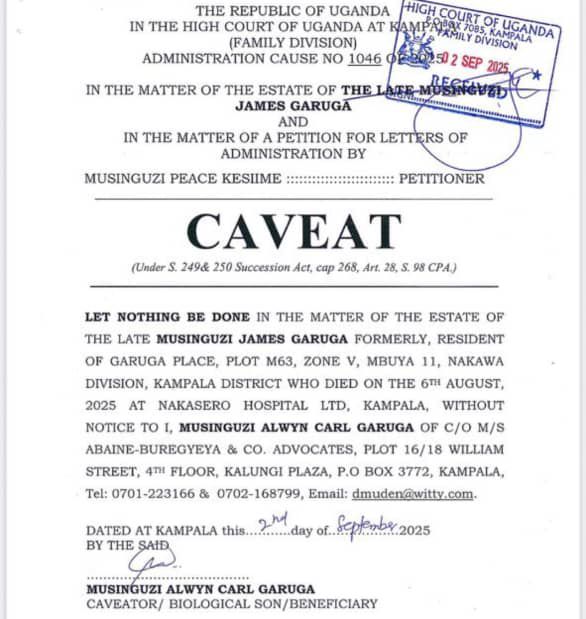 According to court documents accessed by this website, the dispute pits Garuga’s first-born son, Alwyn Carl Musinguzi, against his mother, Peace Kesime Musinguzi, who recently applied for sole letters of administration over the estate. The case has been registered under Administration Cause No. 1046 of 2025 at the High Court in Kampala.